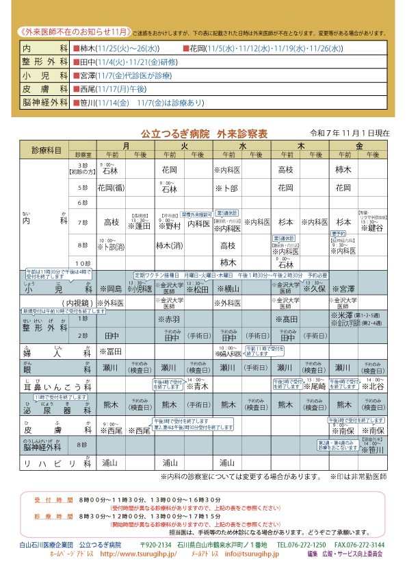 11月の「外来診察表」については、下記のPDFをご覧ください。