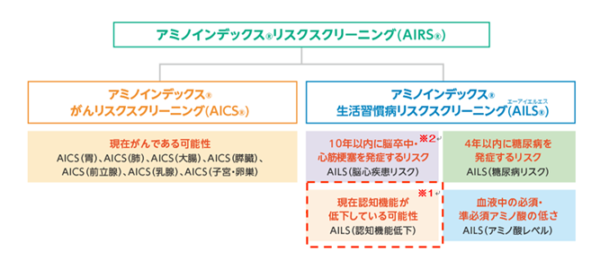 AILS(糖尿病リスク)、AILS(脳心疾患リスク)、AILS(アミノ酸レベル)、AILS(認知機能)の4つの検査項目があります。